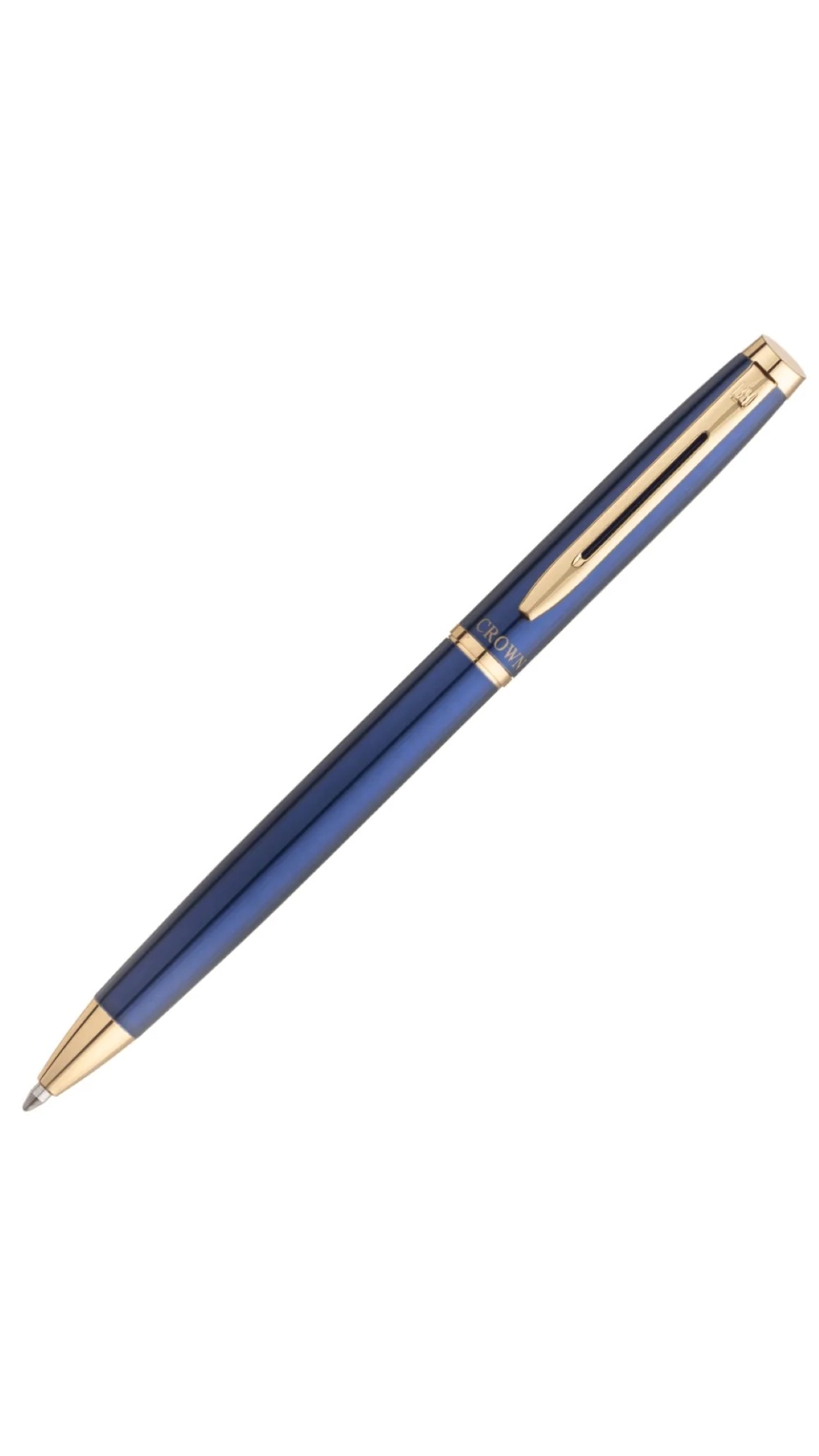 Tem escrita média e vem com carga esferográfica original Crown padrão Parker com tinta de cor azul.